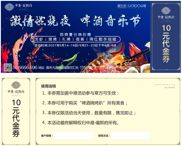 -代金券示意图- 晚上7点活动正式开始 ↓ 客户持有“代金券”上门,至于签到台签到 ↓ 加盖中港活动参与印章,代金券方可生效 ↓ 可通过盖章“代金券”购买相应面额各种美食,超出则需要收费 ↓ 购买好以后,自行找到餐桌至餐桌上,一边听音乐、一边品尝美食 ↓ 晚上9点活动结束