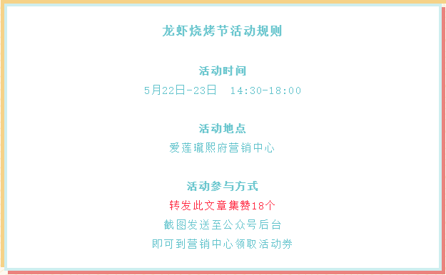 5月入夏,高温天气 在这持续不断的燥热中 唯有一场酣畅淋漓的龙虾盛宴才能尽欢 上周的龙虾节 受到大家的一致好评 仅仅两天的活动时间 每个人似乎都有些意犹未尽 在大家强烈的呼声中 【爱莲瓏熙府】再度强势来袭! 为全城带来一场龙虾狂欢盛宴 !